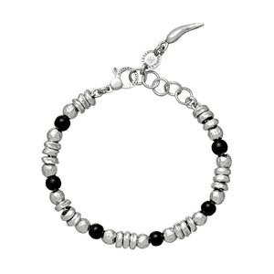 Piccole macine e sferette in argento martellato alternate a sfere lucide di onice nera, fra bianco e nero, luce ed ombra. Il bracciale Optical Mix, ispirato alla moda anni Sessanta, è reso elegantissimo dall'eterno dialogo degli opposti. Fatto a mano in azienda.